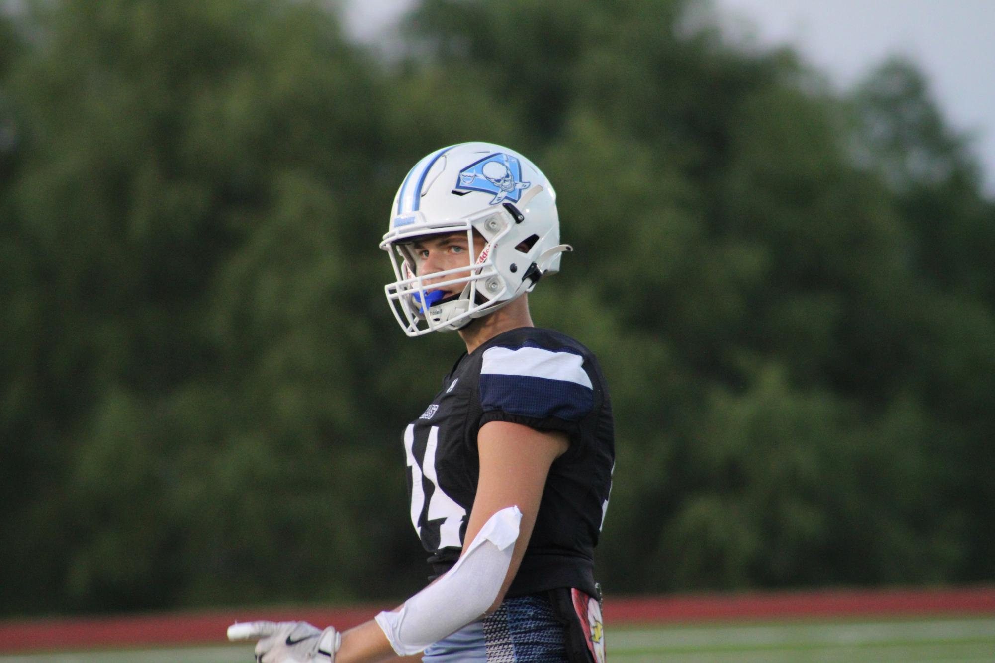 During the football game against Sachse on Oct. 2, sophomore Kaison Moon prepares for a play. Moon has been playing football for five years. “I enjoy football because I get to spend time with my teammates and hit people,” Moon said. Wylie East won 27-7.